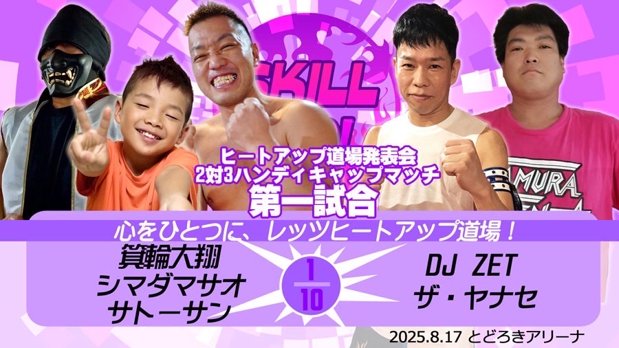 第1試合 2対3ハンディキャップマッチ 10分1本勝負心をひとつに、レッツヒートアップ道場!箕輪大翔&シマダマサオ&サトーサン vs DJ ZET&ザ・ヤナセ