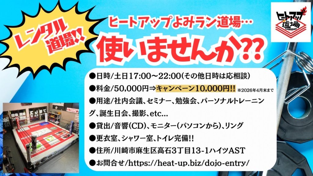 2025年11月に移転した、ヒートアップよみラン道場の道場レンタルキャンペーンを行います。